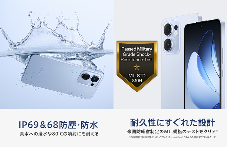 IP69と68の防塵・防水性能を備えており、真水への浸水や80℃のお湯の噴射に耐えることができます。さらに、米軍MIL規格認証をクリア※し、耐久性にすぐれ、安心してご利用いただけます。
