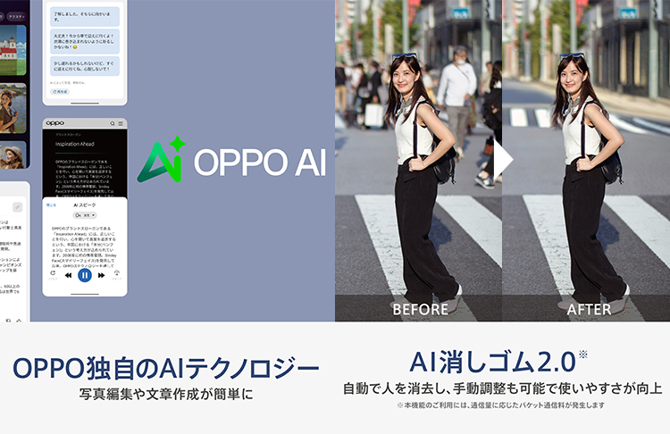 OPPO独自のAIテクノロジーを搭載。進化したAI写真編集機能で、あなたの撮影体験をアップグレード。文章作成、要約、翻訳も助けてくれるから、日常生活がもっとスムーズになります。