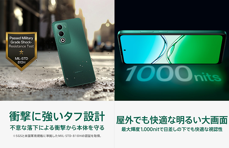ディスプレイは高強度ガラスを採用。SGSおよびMIL規格認証を取得した優れた耐衝撃性で本体を守ります。※1