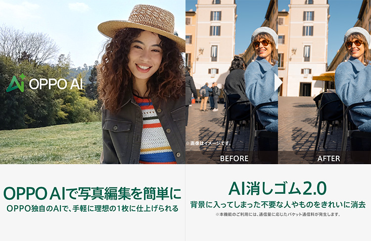 さらに、OPPO 独自のAIテクノロジーを搭載。撮影した写真をシンプルな操作で綺麗に編集でき、理想の1枚に仕上げます。
