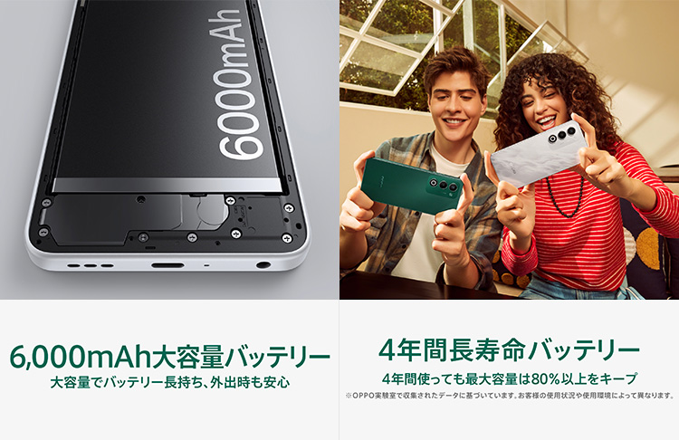 長時間使える大容量バッテリーを搭載。45W SUPERVOOCTMに対応し、スキマ時間に効率よく充電できます。※1また、長寿命バッテリーで4年間使っても最大容量は80%以上をキープします。 ※2