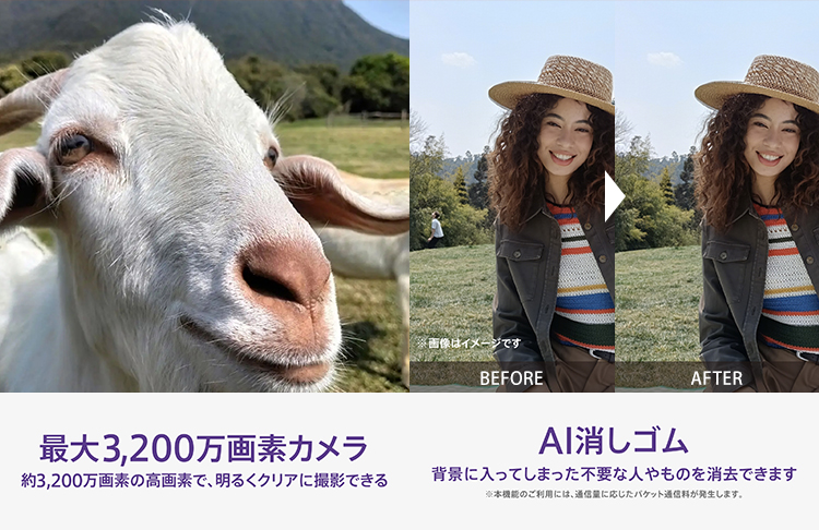 約3,200万画素の高画素カメラで、多くの光を取り込み、明るくクリアな写真を撮影できます。大切な思い出や、風景をきれいに残せます。